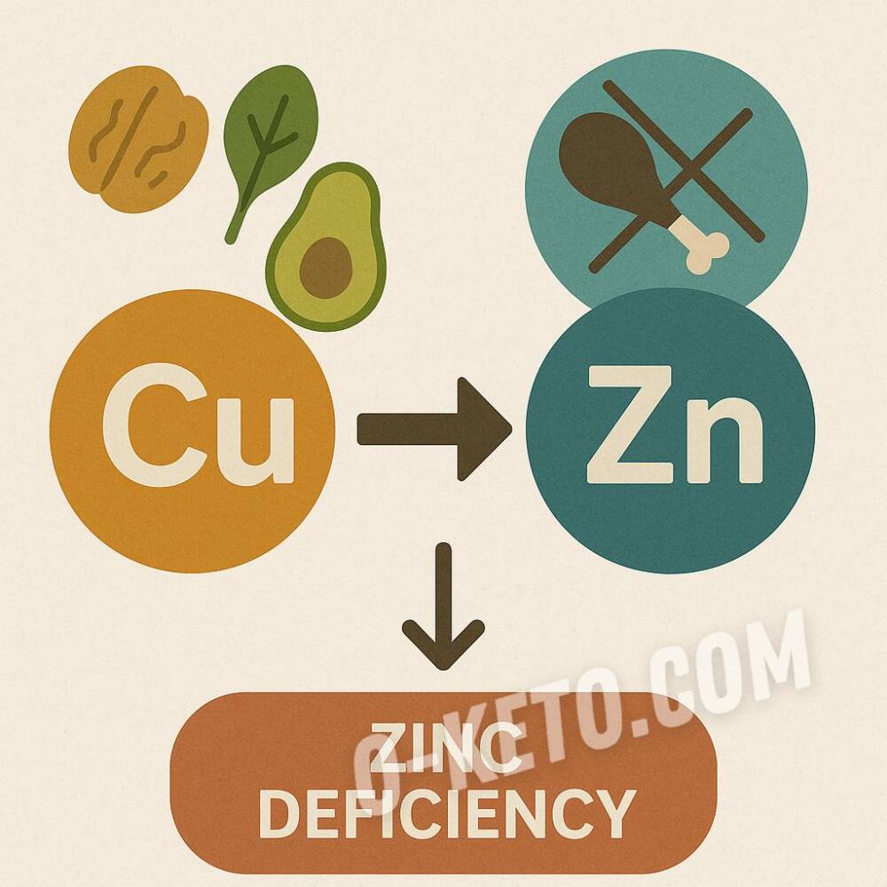 Медь и цинк являются антагонистами: при высоком уровне меди организм снижает усвоение цинка, и наоборот. Поэтому вегетарианцам и особенно веганам важно контролировать уровень цинка — иногда требуется дополнительный приём цинковых добавок (лучше в органических формах: пиколинат, цитрат, глюконат).