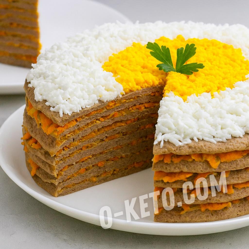 On a flat plate, place the first cooled patty, spread it with sauce, then add some sautéed vegetables. Repeat the layers to form a cake. Decorate the top with grated egg whites and yolks of a boiled egg (1 piece).