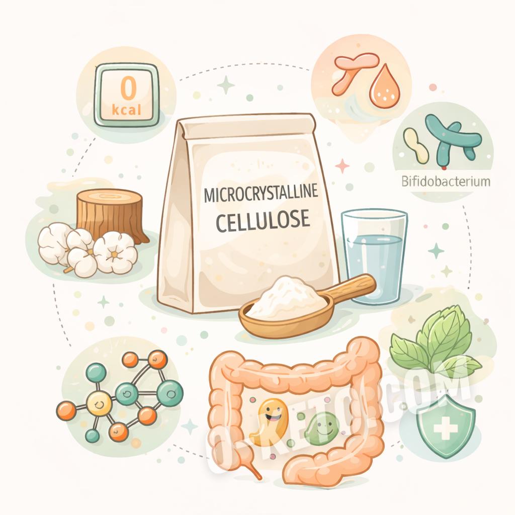 Микрокристаллическая целлюлоза — это форма очищенной целлюлозы растительного происхождения, получаемая из древесины или хлопка путём контролируемого гидролиза. В результате образуется инертное пищевое волокно без вкуса и запаха, которое не переваривается в желудочно-кишечном тракте человека и не участвует в энергетическом обмене. Благодаря этим свойствам микрокристаллическая целлюлоза широко используется в пищевой промышленности, нутрициологии и фармацевтике.