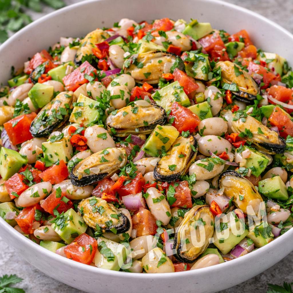 Источник белка и омега-3 жирных кислот, этот салат способствует здоровью сердца и улучшает обмен веществ. Комбинация мидий, авокадо и фасоли создает насыщенный вкус и текстуру, идеально подходя для легкого ужина или закуски.