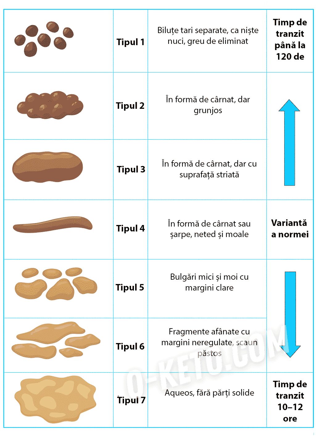 Evaluați frecvența simptomelor și caracteristicilor menționate, legate de funcționarea intestinului gros.