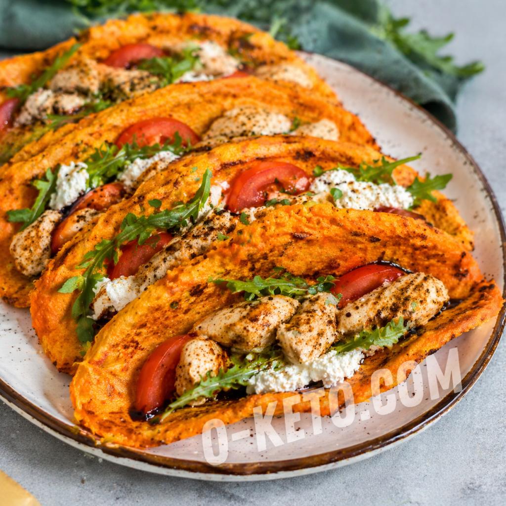 Puneți pe plăcintă puiul, adăugați ricotta (30 g), rucola sau salată (după gust) și roșii (câteva felii). Adăugați puțin sos balsamic (după gust). Rulați plăcinta.